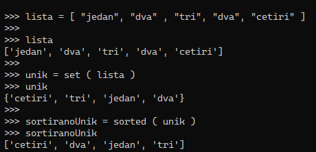 lista = [ "jedan", "dva" , "tri", "dva", "cetiri" ] unik = set ( lista ) sortiranoUnik = sorted ( unik )