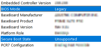 - Bios Mode – Legacy Secure Boot State – Unsupported