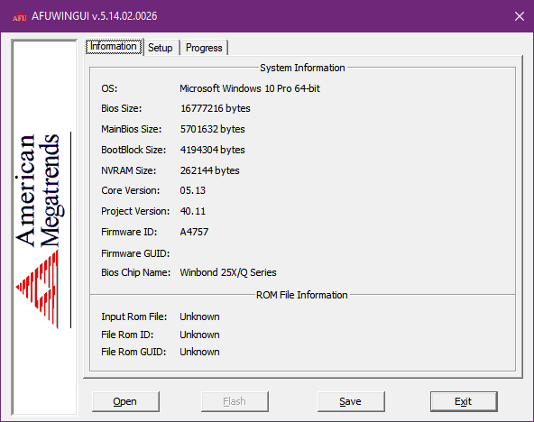 - AFUWINGUI v.5.14.02.D026 Bios Size MainBios Boot Block NVRAM Core Version Project Version Firmware ID Firmware GUID Bios Chip Name Input Rom File File Rom ID File Rom GUID System Information Microsoft Windows 10 64-bit