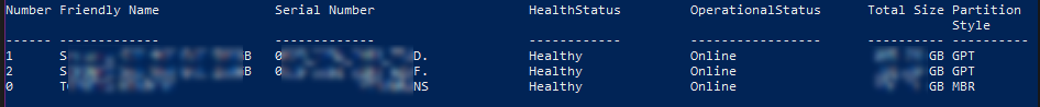 Powershell – “stil” diska – ovdje su tri diska od kojih jedan treba prebaciti iz MBR u GPT (“Number” tog diska je “0”, to zapamti, taj broj ćeš koristiti za MBR2GPT.exe).