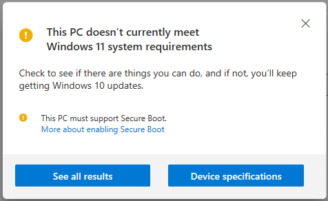 - This PC doesn’t currently meet Windows 11 system requirements Check to see if there are things you can do, and if not, you’ll keep getting Windows 10 updates This PC must support Secure Boot More about enabling Secure Boot